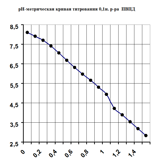 Изучение процесса комплексообразования проводилось методом рН-метрического титрования. Оно проводилось при помощи иономера с точностью измерения ±0,05 ед. рН со стеклянным и хлорсеребряным электродами при температуре 25°С. В стакан для титрования наливали сначала 10мл. 0,1н. раствора ПВПД, затем титровали 1н. раствором HCl при постоянном перемешивании из пипетки. Измерение рН проводили через каждые 0,1мл. прилитых эквивалентов кислоты. Далее таким же образом титровали смесь 5мл. 0,1н. раствора CaCl2 и 5мл. 0,1н. раствора ПВПД. Вязкость исследуемых растворов измерялась в капиллярном вискозиметре Убеллоде, погруженном в термостат при 25 °С. Удельную вязкость раствора вычисляли по формуле: