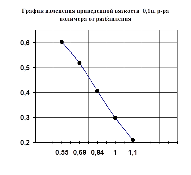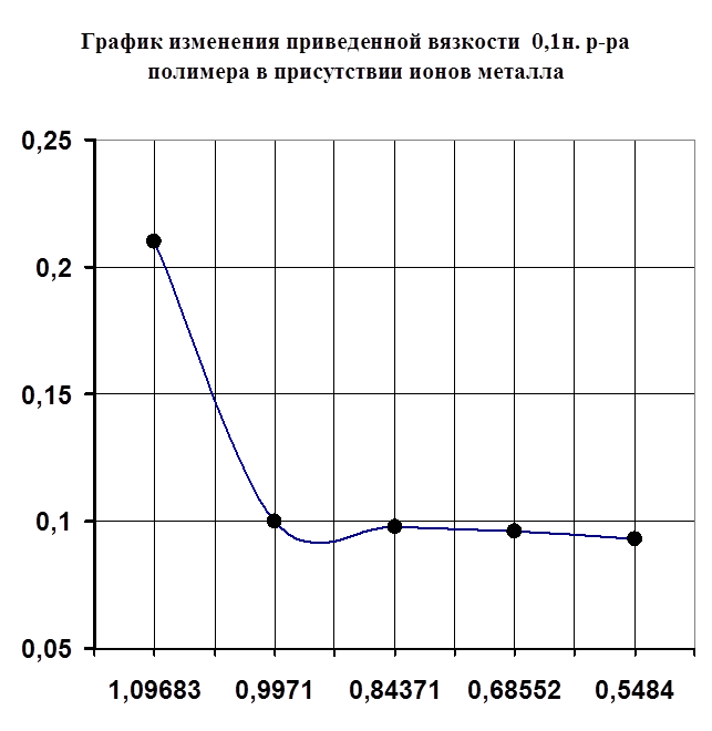 Одним из специфических методов исследования полимеров является метод вискозиметрии в разбавленных растворах полимеров. Он позволяет наблюдать изменение вязкости полимера в присутствии различного вида растворителей, а также солей металлов. Таким образом, мной было исследование изменения вязкости полимера в присутствии растворителя-воды и изменение вязкости при добавлении к раствору полимера порций соли металла (CaCl2 ). На рисунке №3 (приложение А) показано изменение приведенной вязкости (ось ординат) от разбавления (ось абцисс) в отсутствии ионов металла. Из графика виден рост приведенной вязкости, что объясняется силами электростатического взаимодействия между одинаково заряженными звеньями макромолекулы, а также молекулами воды. На рисунке №4 изображена кривая приведенной вязкости ПВПД в присутствии ионов металла. На рисунке видно, что высокое значение приведенной вязкости чистого раствора полимера при разбавлении солью металла резко снижается, что можно объяснить связыванием ионов металла с макромолекулами полимера, что, в сою очередь, приводит к уменьшению гидродинамических свойств последних.