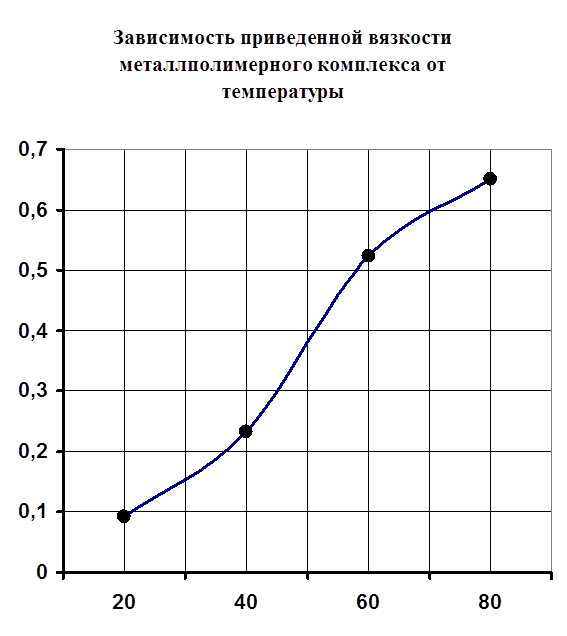 Также было проведено изучение изменения вязкости образовавшегося комплекса от температуры. Нужно отметить, что все предыдущие исследования по изменению вязкости проводились при постоянной температуре 25 °C. В данном же случае проведены исследования при 25, 40, 60, 80 °С. Как видно из построенного графика (рисунок №5) наблюдается рост приведенной вязкости с повышением температуры. В перспективе же возможно выпадение осадка или же переход раствора в состояние геля.