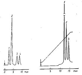 Рис. 2. Хроматограмма изомеров фталевой кислоты, полученная на колонке размером 300 Х 4 мм с µ-бондапаком C18 , подвижная фаза – вода с добавкой реактива А, метанол с добавкой реактива А, градиент от 5 до 40% метанола за 15 мин, скорость потока 2 мл/мин, детектор – УФ (254 нм): 1 – терефталевая кислота; 2 – ортофталевая кислота; 3 – изофталевая кислота