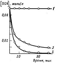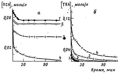 Исходи из данных по предельной степени превращения персульфата калия (ПСК) под действием различных количеств ТКА было показано, что в отсутствие каких-либо добавок ПСК реагирует с ТКА в соотношении 1:2. Однако из кинетических кривых (рис. 1), полученных при разных соотношениях реагентов, видно, что в начальный период ПСК и ТКА расходуются в эквимольном соотношении, а дополнительное количество ТКА вступает в реакцию лишь после того, как значительная часть ПСК уже прореагировала. На основании этих данных можно заключить, что
