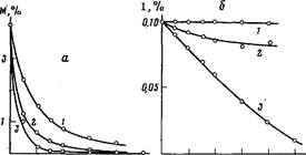 Рис. 3. Кинетические кривые расхода акриламида (а) и персульфата калия (б) в ходе полимеризации без добавок (1), в присутствии 0,035% ТКА (2) и 0,55% аммиака (3). Вода, 50°