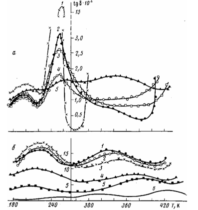 Рис. 1. Температурные зависимости tg 6 для полувзаимопроникающих сеток на основе ППС — ПТДИ при 1 кГц. Содержание ППС: 100 (1), 90 (2), 80 (3), 77 (4), 73 мол.% (5) (а) и 70 (1), 63 (2), 56 (3), 50 (4), 35 (5) и 0 мол.% (6) {б) вращением макромолекулы как целого. Оба процесса обусловлены внутримолекулярными видами подвижности макроцепи.