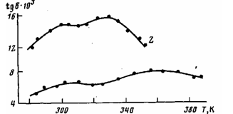 В композициях с содержанием ППС 35—70% диэлектрическое поглощение имеет две области релаксационных потерь (200—230 и 330—400 К). Форма кривых диэлектрической абсорбции дает основание предположить, что каждая из них представляет собой результат частичного совмещения по крайней мере двух различных процессов релаксации дипольной поляризации. Действительно, со стороны высоких температур, применив низкие частоты для образцов с 50 и 70% ППС, удалось добиться разрешения двух пиков диэлектрических потерь (рис. 2). Положение одного из них, локализованного при 300 К, не зависит от содержания ППС и совпадает с областью диэлектрической абсорбции, обусловленной присутствием мочевинных групп в молекулах ПТДИ. На этом основании его можно приписать релаксации поляризации названных полярных групп.
