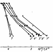 Рис. 3. Зависимость времен релаксации дипольной поляризации от обратной температуры для полувзаимопроникающих сеток с содержанием ППС 35 {1), 50 (2), 56 (3, 3'), 63 {4, 4'), 70 (5, 5'), 73 (6, 6'), 100% (7, 7') (цифры со штрихами относятся к процессам ниже комнатной температуры)