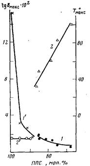 Из кривых рис. 1, б и 4, где приведены зависимости tg δMaKC и соответствующей ему температуры Тмакс α- и α1 сопроцессов в ППС при 1 кГц от количественного состава полувзаимопроникающих сеток, можно сделать вывод о качественно различном состоянии в композициях с содержанием ППС больше и меньше 70%. Это следует из резкого исчезновения области cCi-перехода в образцах с 70% ППС и более, относимой к сегментальным процессам в ППС в переходных слоях, где оба компонента можно считать молекулярно совмещенными. Одновременно наблюдается проявление интенсивного α-перехода в сегрегированной фазе ППС, отделенного при 1 кГц от α-области почти на 50°.