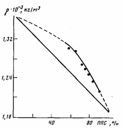 Следует отметить, что во всем диапазоне составов плотность рассматриваемых композиций превышает значения, рассчитанные по правилу аддитивности для смесей (рис. 5). Наибольшее отклонение наблюдается для составов с 60—70% ППС. Отклонение концентрационной зависимости р от аддитивной подтверждает наличие молекулярных взаимодействий между цепями обоих компонентов.