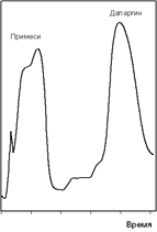 Пример очистки даларгина Tyrd-AlaClyPheLeuAsg от примесей: TyrPheLeuAsg и изомера TyrL-AlaClyPheLeuAsg . Содержание даларгина в сыром продукте - 85 вес.%, в очищенном - 97.5 вес.%. Колонка 10 х 120 см Скорость потока 5000 мл/час. Проба: 450 г сырого даларгина. Ступенчатый градиент: 30 литров 0.1 М Py/Ac pH=4.5 10 литров 0.4 М Py/Ac 30 литров 0.6 М Py/Ac