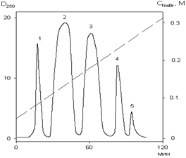 Градиент: 10 - 90% B в течение 45 мин, UV 254 нм