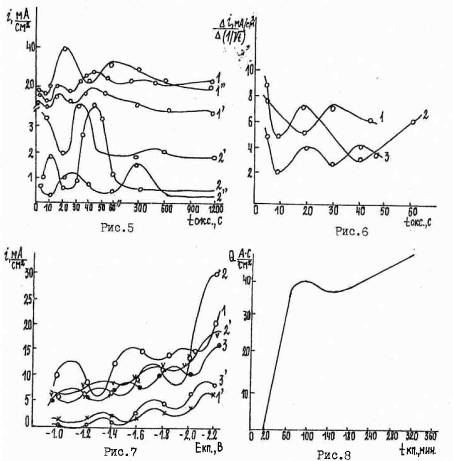 2.На оксидированном медном электроде плотность тока катодного внедрения i п кальция снижается в несколько раз. Зависимость ijq-jот длительности предварительного оксидирования носит периодический автоколебательный характер. Амплитуда колебаний тока возрастает, а их частота уменьшается по мере установления в системе стационарного состояния.