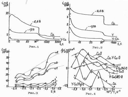 5.Исследовано катодное внедрение иттрия в оксидированные пленки меди на подложках из стали, алюминия и магния. Установлено, что плотность тока катодного внедрения иттрия наиболее высока в случае оксидированных Си(Ре)электродов и снижается в ряду Си (Ре) >окс Си(А1) > окс Си(м) . Последующее модифицирование слоев У-Си-0 фазы кальцием характеризуется на порядок более высокой плотностью тока для электродов на М0- подложке и практически не изменяется на подложках из А1 и стали. Характер зависимости YSL~ 1//Т позволяет говорить, что периодические окислительно-восстановительные реакции в (формируемых фазах У-Си-0 и Са-У-Си-0 сопровождаются структурными преобразованиями, очень чувствительными к материалу подложки..
