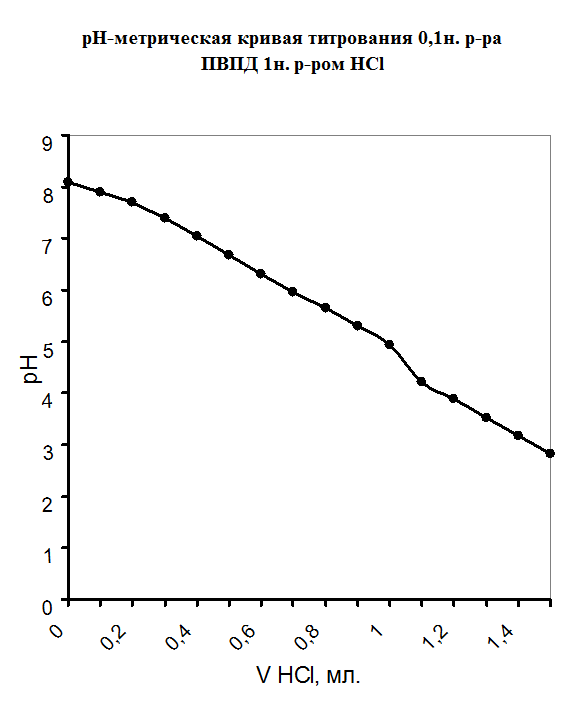 1. Методами рН-метрического титрования и вискозиметрии обнаружено и доказано комплексообразование в системе поливинилпирролидон-Cd2+ и Co2+ . Обнаружено, что поливинилпирролидон не образует комплексы с железом (II) в данных условиях.