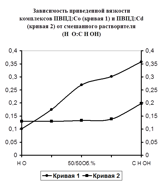 3. Изучено влияние состава растворителя на стабильность металлполимерных комплексов. Обнаружено, что комплекс ПВПД- Cd2+ почти не изменяет приведенной вязкости с увеличением объемных процентов спирта этилового С2 Н5 ОН, что указывает на его прочность к действию органических растворителей. С другой стороны, комплекс ПВПД-Со2+ сохраняет свои характеристики только в водной среде.