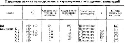 В таблице приведены результаты исследования структуры ПЭ и композиций рентгенографическим методом. Было установлено, что пленки ПЭ, К-1 и К-5 при приведенных выше условиях переработки получаются неориентированными; К-2 слабо ориентирована и характеризуется α-текстурой кристаллитов ПЭ с углом дезориентации ф=48°; К-3 более ориентирована. Она также характеризуется α-текстурой кристаллитов ПЭ. Для К-3 на кривой азимутального распределения интенсивности наблюдаются два рефлекса 110 (т. е. на текстуррентгенограмме их будет 4). Следовательно, ориентация кристаллитов ПЭ в композиции, полученной при степени вытяжки 4, более совершенна, угол дезориентации рефлекса 110 составляет 25°. Композиция К-4 имеет высокоориентированную с-текстуру кристаллитов с углом дезориентации ф=13°. Повышение степени анизотропии К-4 связано с понижением температуры приемных валков каландра до 60°.