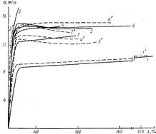 Механические и релаксационные свойства композиций изучали на испытательной машине «Инетрон». Деформационно-прочностные свойства определяли при растяжении со скоростью 100 мм/мин, релаксацию напряжения исследовали в неизотермическом режиме при скорости подъема температуры 1 град/мин и постоянной деформации 0,4%.
