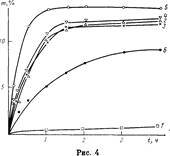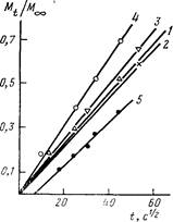 Из кинетических кривых набухания были определены Mt (набухание за время t) и Ма,(равновесное набухание) и определено соотношение Mt jM.Построение графиков зависимости MtJMот itпозволило установить применимость для расчета коэффициента диффузии уравнения Фика при соотношении М/Л/=0=50,6. При этом уравнение диффузии упрощается и принимает вид