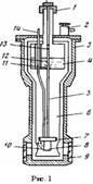 Рис. 1. Схема криостата: 1 — крышка, 2 — вакуумный вентиль, 3 — корпус, 4 - резервуар для хладоагента, 5 - хладопровод, 6 - вакуумная полость, 7 — электронагреватель, 8 — держатель образца, 9 — окно, 10 - датчик температуры, 11 — пробка, 12 — патрубок, 13 — отверстие для прохождения паров азота, 14 — патрубок