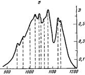 Рис. 3. Отнесение максимумов «тонкой» структуры полос vas Si—О—Si в низкотемпературном (-196°) спектре полисилоксановых пленок (по оси ординат — оптическая плотность пленок) (а) и схема соответствующих переходов (за ноль масштаба энергий принят основной уровень Nas =0, ге=0, 1=0) (б). Пояснение в тексте