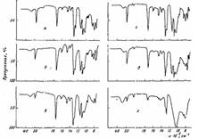 Рис. 2. ИК-спектры полисилоксановой пленки при 20 (а), -18 (б), -21 (в), -23 (г) и -196° (д)