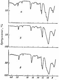 Рис. 5. ИК-спектр полисилоксановой пленки при —196°: а — исходная пленка, 6 — после нагревания в атмосфере водорода при 250° 30 мин, в - после нагревания в вакууме (=5-10—3 Па) при 25СГ 30 мин