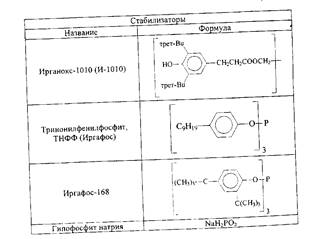 С целью получения полимеров, обладающих высокими физико-механическими и физико-химическими характеристиками, синтезы осуществляли в присутствии стабилизирующих добавок, приведенных в табл. 1. В качестве стабилизаторов были использованы Ирганокс 1010, тринонилфе-нилфосфит, Иргафос-168, гипофосфит натрия - NaH2 PО2 .