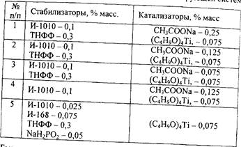 Были проведены синтезы с добавками различного количества стабилизаторов и катализаторов, некоторые из которых представлены в табл. 2.