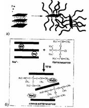 Кроме того, в целях внедрения и хорошего распределения пластин слоистого силиката в полимере была разработана методика закрепления катализатора на поверхности слоистого силиката. Таким образом, формирование макромолекул происходило непосредственно на поверхности нанонаполнителя. Схема процесса полимеризации мономера на поверхности силиката приведена на рис. 3 (а, б).