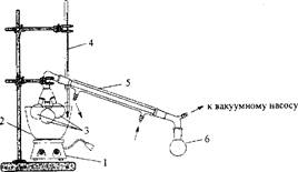 Рис. 4. Установка для проведения ТФПК. 1 - нагревательный элемент; 2 - масляная баня; 3 - реакционные колбы; 4 - контактный термометр; 5 - холодильник; 6 - приемник