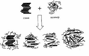 Процесс формирования слоистосиликатного нанокомпозита протекает через ряд промежуточных стадий [12] (рис. 5). На первой стадии происходит образование тактоида - полимер окружают агломераты органомодифицированного слоистого силиката. На второй стадии происходит проникновение полимера в межслойное пространство слоистого силиката, в результате чего происходит раздвижение слоев силиката. Дальнейшее увеличение расстояния между слоями (третья стадия) приводит к частичному расслоению и дезориентации силикатных слоев. На последней стадии происходит эксфолиация.
