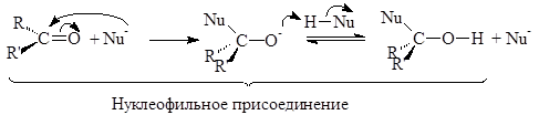 Основной реакцией карбонильных соединений является реакция нуклеофильного присоединения, протекающая по механизму: