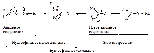 Ацильная группа включает карбонильную группу. Реакции ацильных соединений проходят по механизму нуклеофильного присоединения - элиминирования: