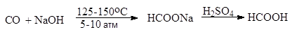 А. Муравьиную кислоту получают в промышленности взаимодействием окиси углерода с водным раствором гидроксида натрия при высокой температуре и давлении: