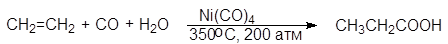 В. Алкены реагируют с окисью углерода и водяным паром в присутствии тетракарбонила никеля и других катализаторов при нагревании под давлением с образованием карбоновых кислот: