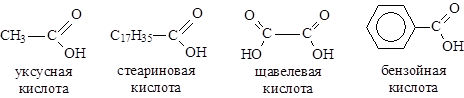 По числу карбоксильных групп делятся на монокарбоновые (одноосновные) и дикарбоновые (двухосновные), в зависимости от строения углеводородного скелета - на алифатические (уксусная, щавелевая) и ароматические (бензойная).