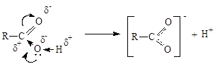 Взаимное влияние составляющих карбоксильную группу карбонила и гидроксила с одной стороны уменьшает поляризацию связей С=O карбонила, с другой стороны ослабляет связь О-Н гидроксила, что приводит к отсутствию реакций нуклеофильного присоединения AN и увеличению подвижности водорода гидроксила (кислотные свойства).