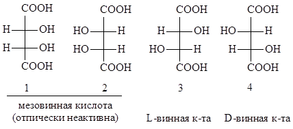 Для идентификации оптических изомеров гидроксилслдержащих веществ применяют D-L-номенклатуру. Оптические изомеры винной кислоты представлены на рисунке.