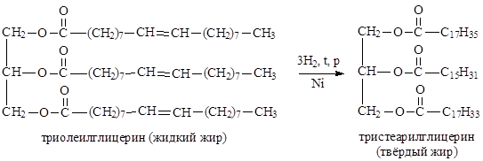 Реакции присоединения: гидрирование или гидрогенизация - получение твердых жиров из жидких. Характерна для жидких жиров, содержащих кратные связи.