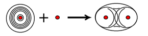 Электронное облако в области между ядрами, без которого нельзя представить себе химическую связь, возникает в результате перераспределения электронного движения. Это можно представить себе как следствие сближения атома и протона. Из окрестностей лишь одного из ядер электрон перемещается в общую область, где оба ядра физически равноправны. Движение электрона, ранее совершавшееся в сферическом поле, становится двухцентровым – эллипсоидновидным. Отсюда и нагнетание электронной плотности в межъядерный регион за счёт обеднения периферии. Иллюстрацией этого процесса может служить и качественный рисунок, и уравнение, построенное по типу привычного уравнения химической реакции.
