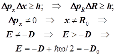 Вместе с тем основное состояние не может быть связано в точности с минимумом адиабатического потенциала, поскольку минимум на кривой соответствует фиксированному равновесному межъядерному расстоянию, что противоречило бы принципу неопределённости Гейзенберга. При статически фиксированной длине связи импульс ядер должен был бы быть совершенно неопределённым. Это противоречие устраняется, если истинный уровень энергии сдвинуть немного выше минимума адиабатического потенциала. (рис. )