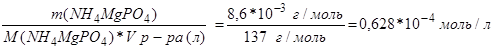 С (NH4 MgPO4 ) = С (NH4 + ) = С (Mg2+ ) = С (PO4 3- ) = 6,2810-5 моль/л