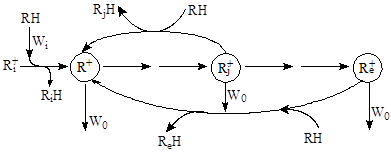 В целом механизм процессов крекинга парафинов, олефинов, скелетной изомеризации парафинов и олефинов, реакций деалкилирования алкиларенов является цепным с кинетической точки зрения. Все эти процессы включают стадии инициирования, зарождения активных центров R+ (Wi ), стадии продолжения кинетической цепи с участием ионов карбения и карбония и стадии обрыва активных R+ (W0 ) за счет примесей в реакционной смеси. Добавки долей процента олефинов к чистому алкану резко ускоряют процесс каталитического крекинга.