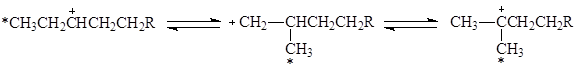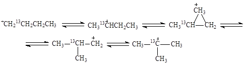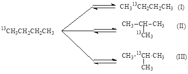 Вместе с тем, 1,2-перенос алкильной группы не объясняет факты, установленные при изучении изомеризации меченого 13 С бутана. Обнаружены два изомера и две пары изотопомеров: