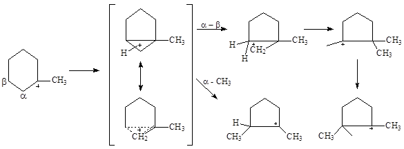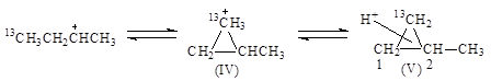 Образование изомеров I и III нельзя объяснить 1,2-переносом CH3 -группы. Механизм этих реакций объясняют с позиций образования ионов карбония. При 1,2-сдвиге метильной группы в первичном ионе карбения образуется ион карбония (IV), который можно рассматривать как продукт протонирования циклопропанового кольца (V):