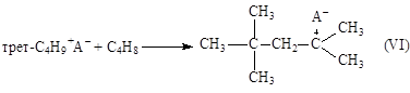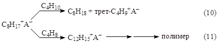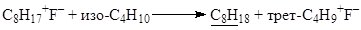 Карбкатион (VI) C8 H17 + взаимодействует с изо-C4 H10 , отрывает от него Н– и превращается в изооктан C8 H18 (целевой продукт реакции). Нежелательный процесс – дальнейшее присоединение олефина с последующей полимеризацией.