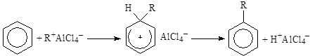 который также может переносить протон на олефин с образованием R+ AlCl4 – . Реакция карбкатиона CH3 CH2 + или (СН3 )2 СН+ с бензолом и приводит к реакции алкилирования ArH.