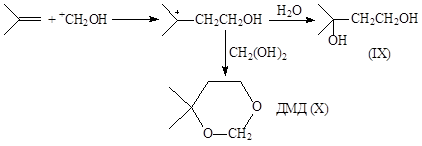 Оба продукта при дегидратации (IX) или отщеплении метиленгликоля (формальдегидгидрата) (X) образуют изопрен, однако, второй путь эффективнее – ДМД легко выделяется из реакционной среды и легко отщепляет CH2 (OH)2 (200о С, кислотные катализаторы). ДМД является также хорошим полярным растворителем.