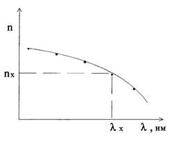 | При визуальном качественном АЭА строят дисперсионную кривую (рис.2.3.1) используемого прибора (стилоскопа, стилометра), т.е. градуировочный график прибора, выражающий зависимость между показаниями его отсчётного барабана и длиной волны линии в эталонном спектре n = f () (меди, железа и др.). Затем поочерёдно фиксируют все линии в спектре пробы анализируемого | Рис.2.3.1. Дисперсионная кривая прибора |