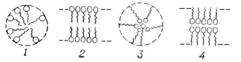 В лиофильных золях, коллоидных дисперсиях типа гидрозолей мыл, например олеата натрия или лаурилсульфата калия, М. представляет собой ассоциат (объединение) молекул. В каждой такой молекуле длинный углеводородный (гидрофобный) радикал связан с полярной (гидрофильной) группой. При образовании М. несколько десятков или сотен молекул объединяются так, что гидрофобные радикалы образуют ядро (внутреннюю область), а гидрофильные группы — поверхностный слой М. Если дисперсионной средой является органическая жидкость, ориентация молекул в М. может быть обратной: в ядре сосредоточатся полярные группы, тогда как гидрофобные радикалы будут обращены во внешнюю фазу. Изобразив молекулу мицеллообразующего вещества в виде волнистой линии (гидрофобный радикал) с кружочком на конце (гидрофильная группа), можно представить простейшие структурные типы М. схемами: