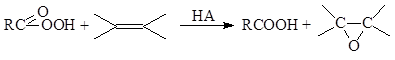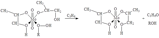 где FMo = 1 + KГПЭБ[ГПЭБ] + KМФК[МФК] + KОП[ОП] + KH2O[H2O] есть закомплексованность катализатора, МФК – метилфенилкарбинол, ОП – пропиленоксид. Ki – константы равновесия образования соответствующих комплексов Mo. Как видно из уравнения (20), процесс протекает с лимитирующей стадией, переходное состояние которой включает ГПЭБ, Mo(VI) и пропилен. Показано, что активным катализатором является пропиленгликолятный комплекс Mo(VI), реакция которого с ГПЭБ и C3H6 приводит к ОП.