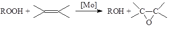 Халкон-процесс. Эпоксидирование олефинов гидропероксидами осуществляется в промышленном варианте в растворах комплексов Mo(VI). В качестве ROOH используют 2-этилфенилгидропероксид (гидропероксид этилбензола, ГПЭБ), гидропероксид кумила (ГПК) и третбутилгидропероксид (ТБГП). В случае ГПЭБ сопряженно с пропиленоксидом получают стирол: